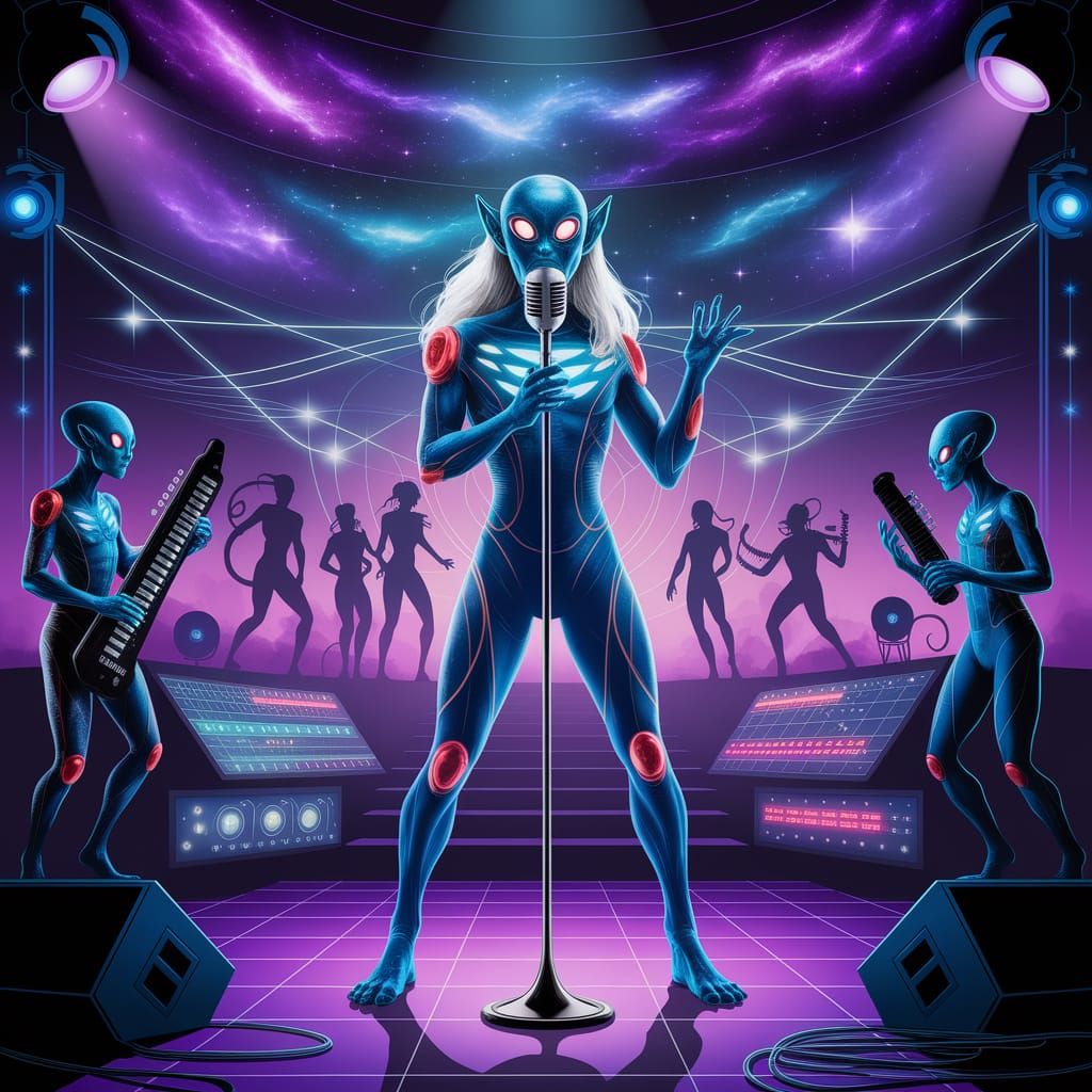 This vibrant, futuristic scene depicts a cosmic nightclub performance by an elegant humanoid alien, surrounded by surreal sci-fi instruments and star-like laser effects, in a richly detailed, purple and blue-lit atmosphere.