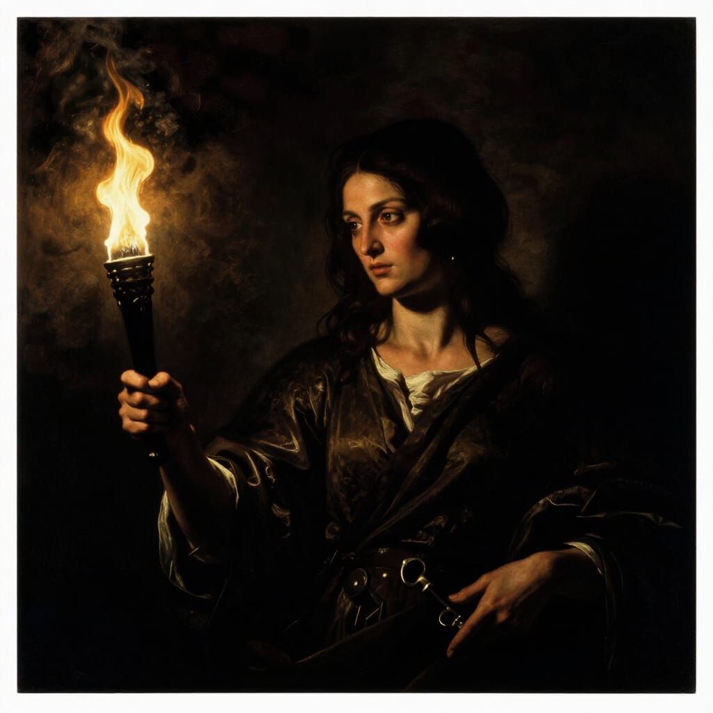 A cinematic image of Hecate emerging from deep shadow, lit by a single torch. Features intense realism, a baroque painterly style, and dramatic light and shadow contrast.