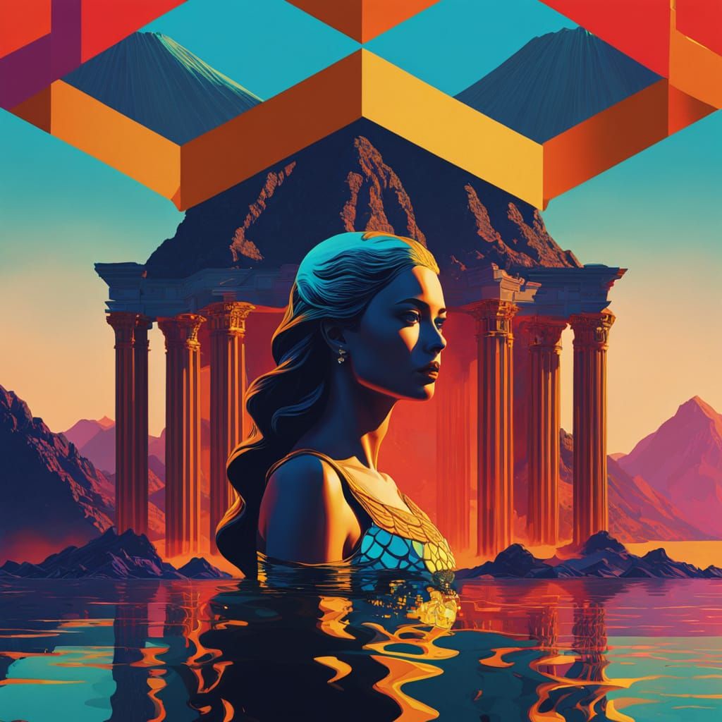 This image shows a mermaid in a pop art style, set between a volcano and the sea. The digital artwork features triadic colors, geometric shapes, and golden lighting, in a vibrant and symmetrical composition.