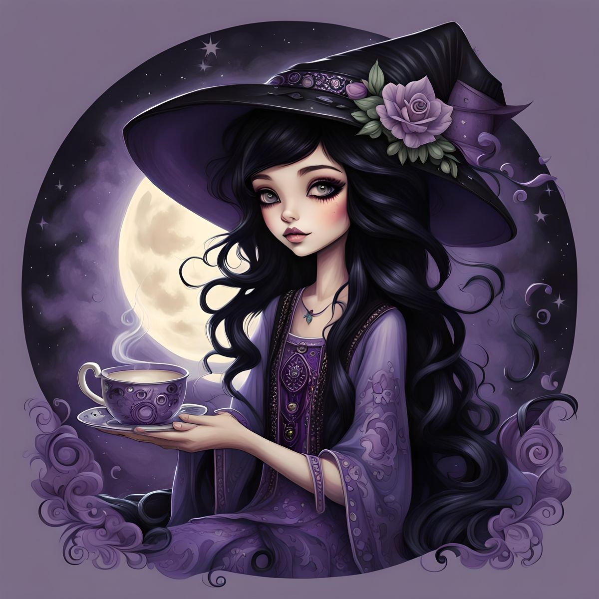 A captivating image of a delighted dark-haired witch girl with shiny eyes, rendered in soft purples. This portrait evokes a whimsical, gothic art style.