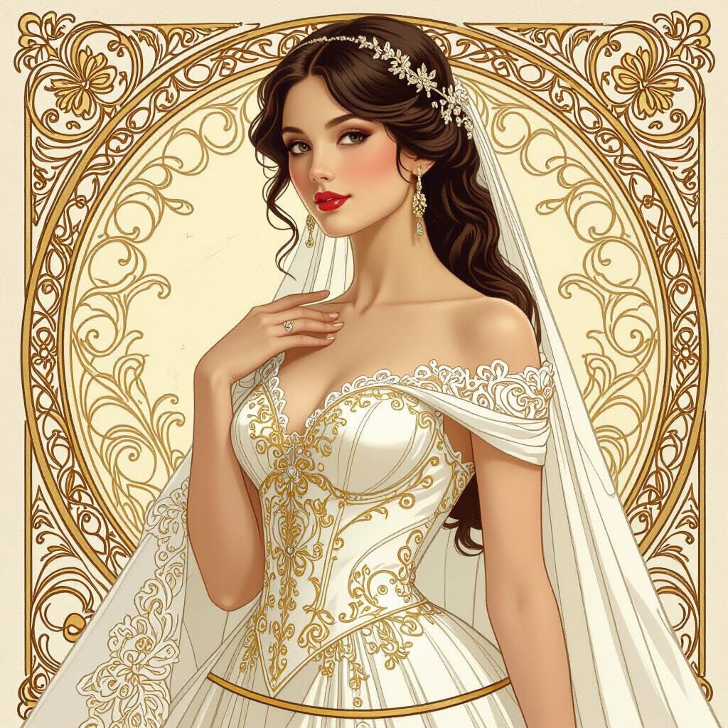 A striking picture of a woman wearing a white and gold wedding gown. The gown features ornate lace and embroidery. The art is reminiscent of art nouveau illustrations.