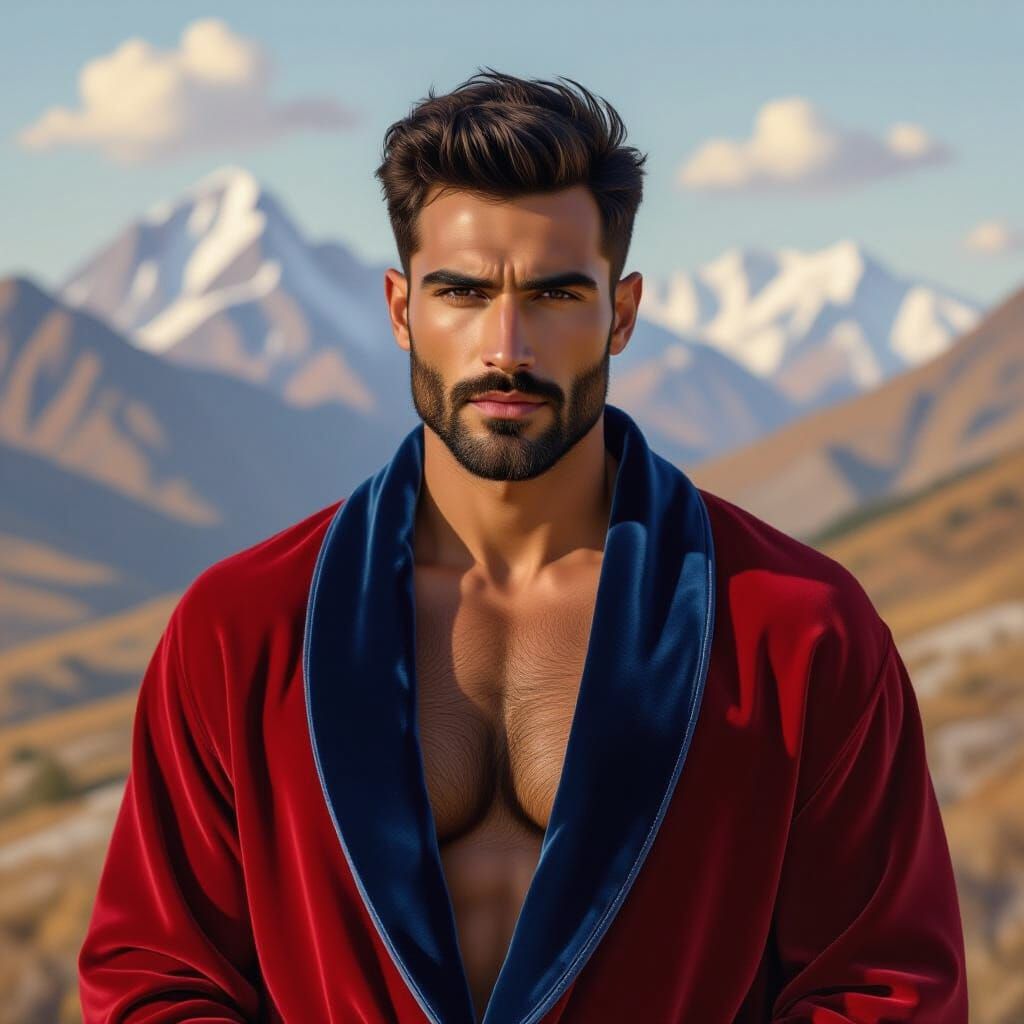 A portrait of a Turkish Indian man in a red robe against a mountain backdrop. The artwork features thick textured paint and a vibrant, warm color palette reminiscent of Impressionism.