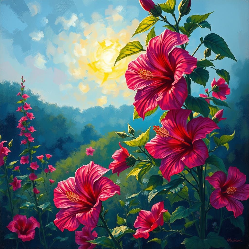 A vibrant landscape featuring radiant hibiscus flowers. The image is rendered with bold brushstrokes and impasto techniques, giving it a bioluminescent, dreamy aesthetic.