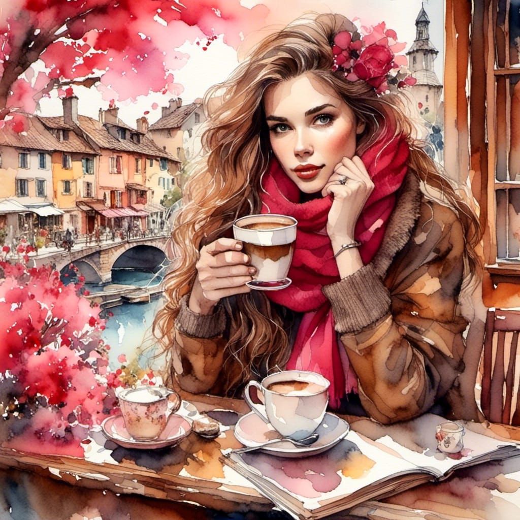 A vibrant alcohol ink artwork of a beautiful woman with brown hair in a cozy bar. She wears a wool shirt, cap, and chiffon scarf while enjoying a hot chocolate coffee in red and pink hues.