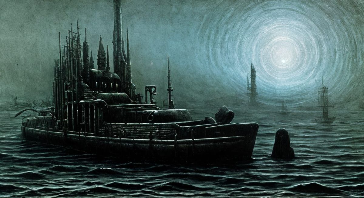 A surreal image shows a ghost ship sailing at night. The dark, detailed artwork evokes the style of surrealist masters, realized with striking detail.