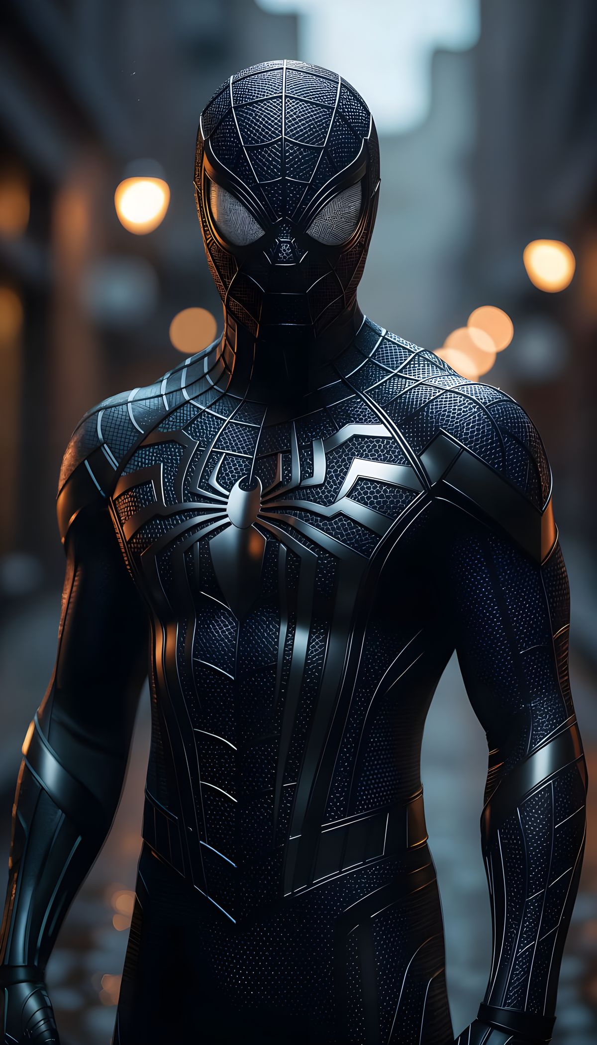 This hyper-detailed image captures Symbiote Spider-Man in a monochromatic, noir style with deep shadows and dramatic rim lighting. Photorealistic 8k render showcases glossy textures and a minimalist composition.
