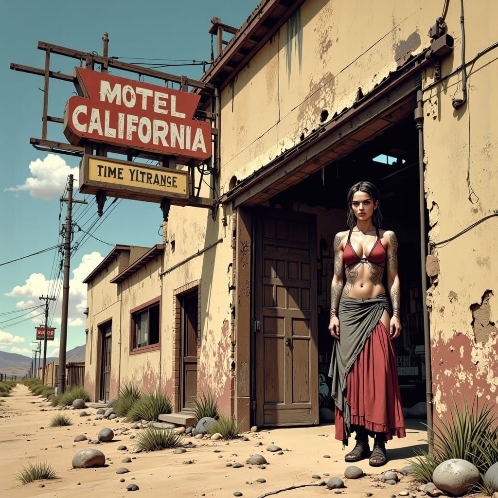 A haunting image of a crumbling desert town's hotel, set against a desolate post-apocalyptic backdrop, where a man and woman stand amidst the ruins, surrounded by the eerie, industrial beauty of a bygone era.