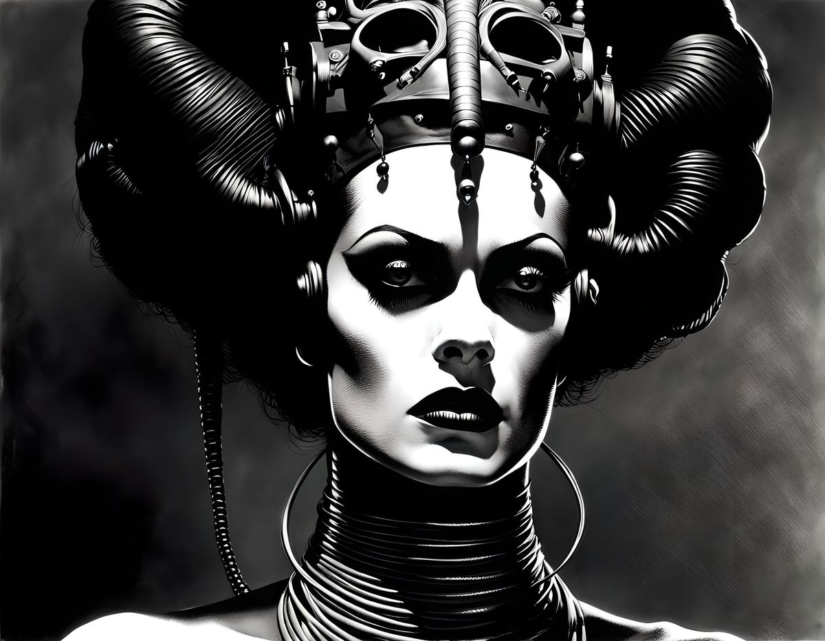Bride of frankenstein. female, woman frankenstein, strong noir 1920. black and white. full body portrait, dark eyes. giger. simon bisley. be...