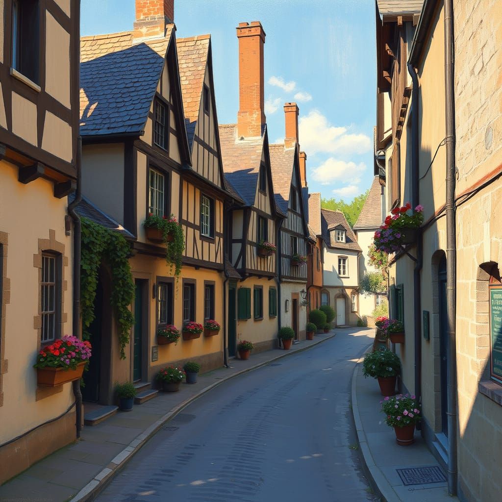This image captures a charming medieval village street scene, with half-timbered houses, colorful flower boxes, and a cobblestone road bathed in warm sunlight and long shadows, reminiscent of Impressionist art