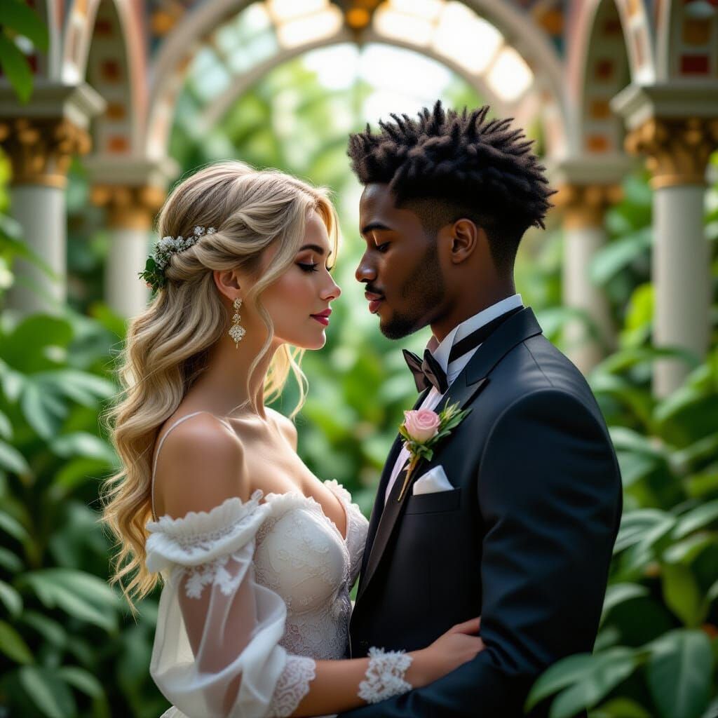 This image showcases a blonde woman and a black man sharing a romantic moment in a vibrant garden. The hyperdetailed resin cast art style blends solarpunk, renaissance, and retrofuturism.