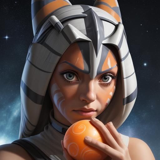 This image shows Ahsoka Tano from Star Wars reimagined as Naruto, preparing to attack with a galaxy-filled orb in hand. A professional portrait with sharp focus and studio lighting.