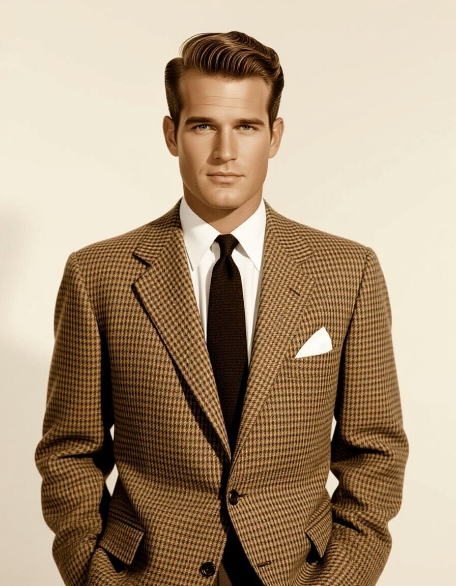 This image shows a young man in mid-century formal wear, reminiscent of classic studio portraits. The picture features clean lighting and warm tones, capturing an elegant and confident style.