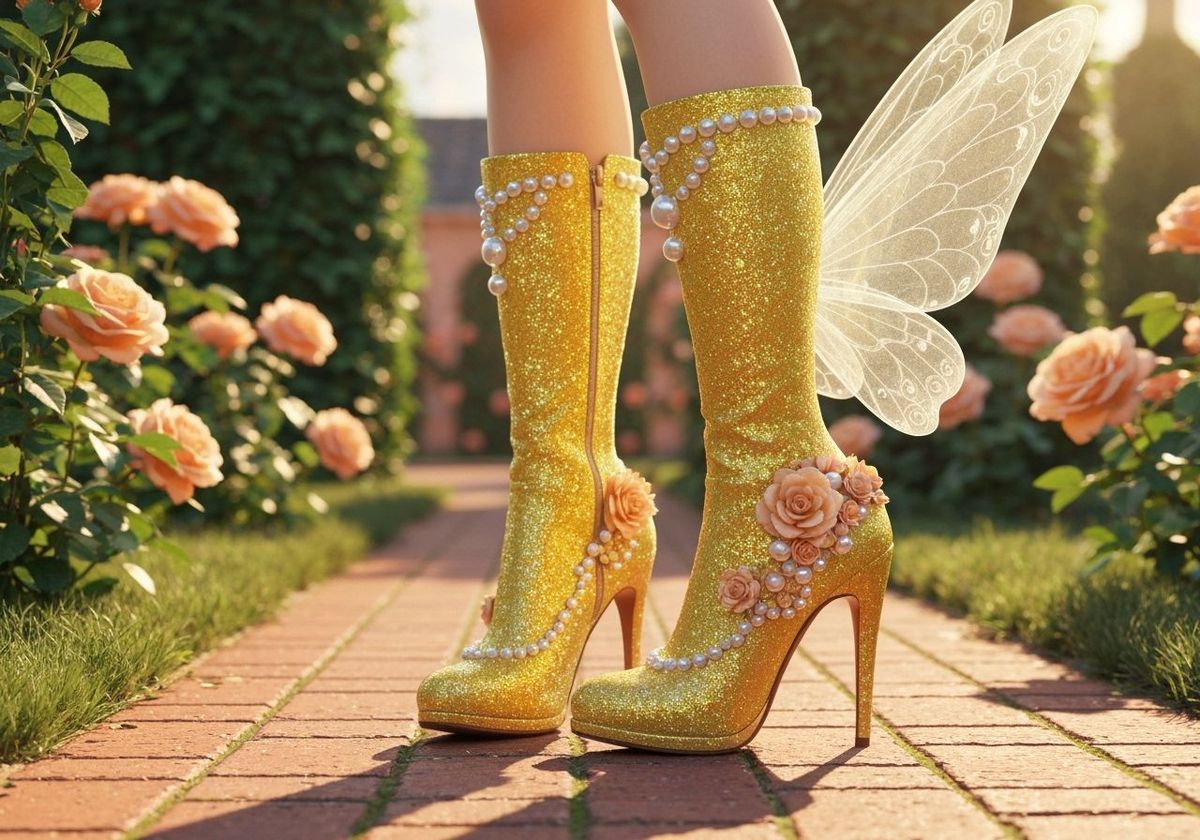 This image shows yellow glittery high-heeled boots adorned with floral and pearl embellishments and fairy wings. The boots stand on a brick path in a garden filled with peach roses under warm, sunny lighting. The style is whimsical and highly detailed.