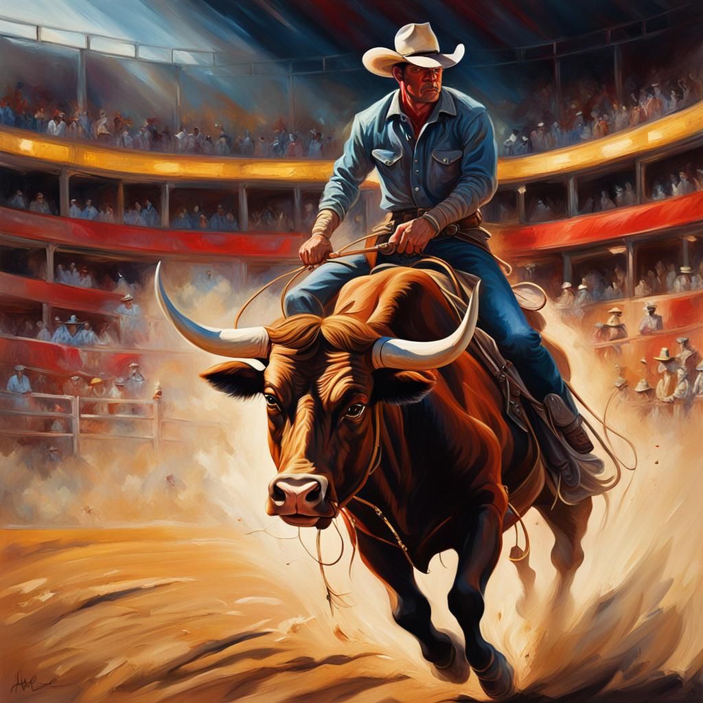 A vibrant oil painting of a cowboy riding a bull in a rodeo arena. The artwork captures the intense movement and energetic atmosphere with dynamic lighting and bold brushstrokes.