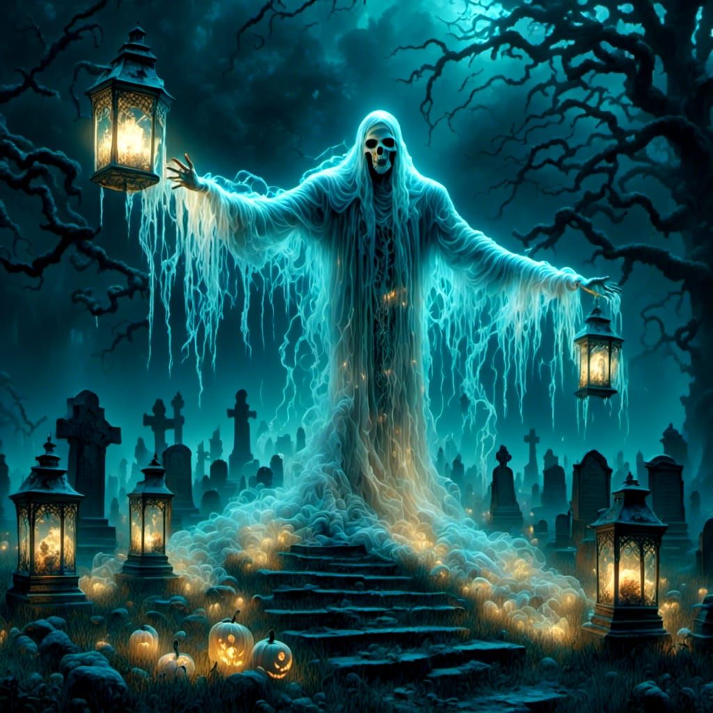 This image shows a spectral demon emerging from a grave to startle a gravedigger at twilight. A glowing lantern illuminates the scene, which features cloud animals in a fantastical style.