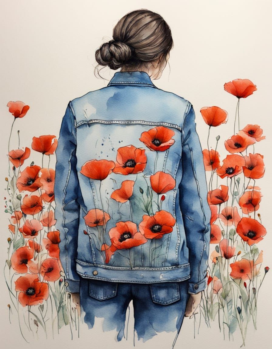 A serene watercolor painting of a woman's back, wearing a blue denim jacket adorned with delicate poppy embroidery, rendered in soft pastel hues.