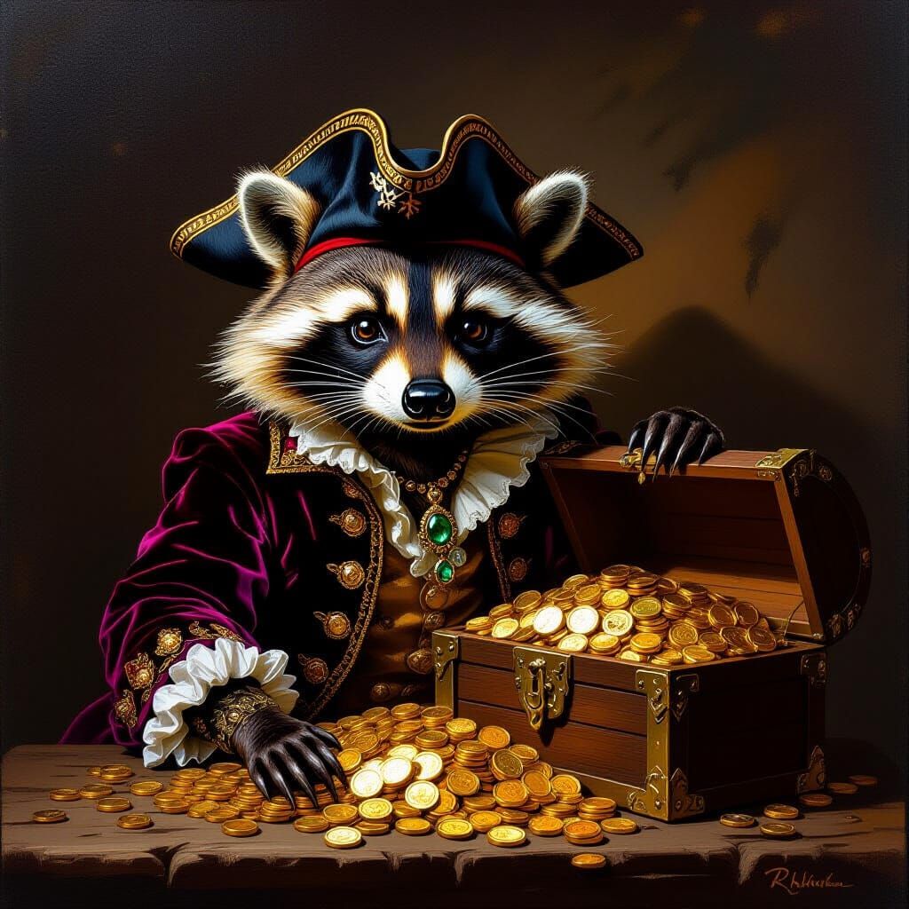 This image depicts a regal raccoon in pirate attire, sitting by a treasure chest overflowing with gold and jewels. The scene is lit dramatically, evoking Dutch Golden Age still life paintings.