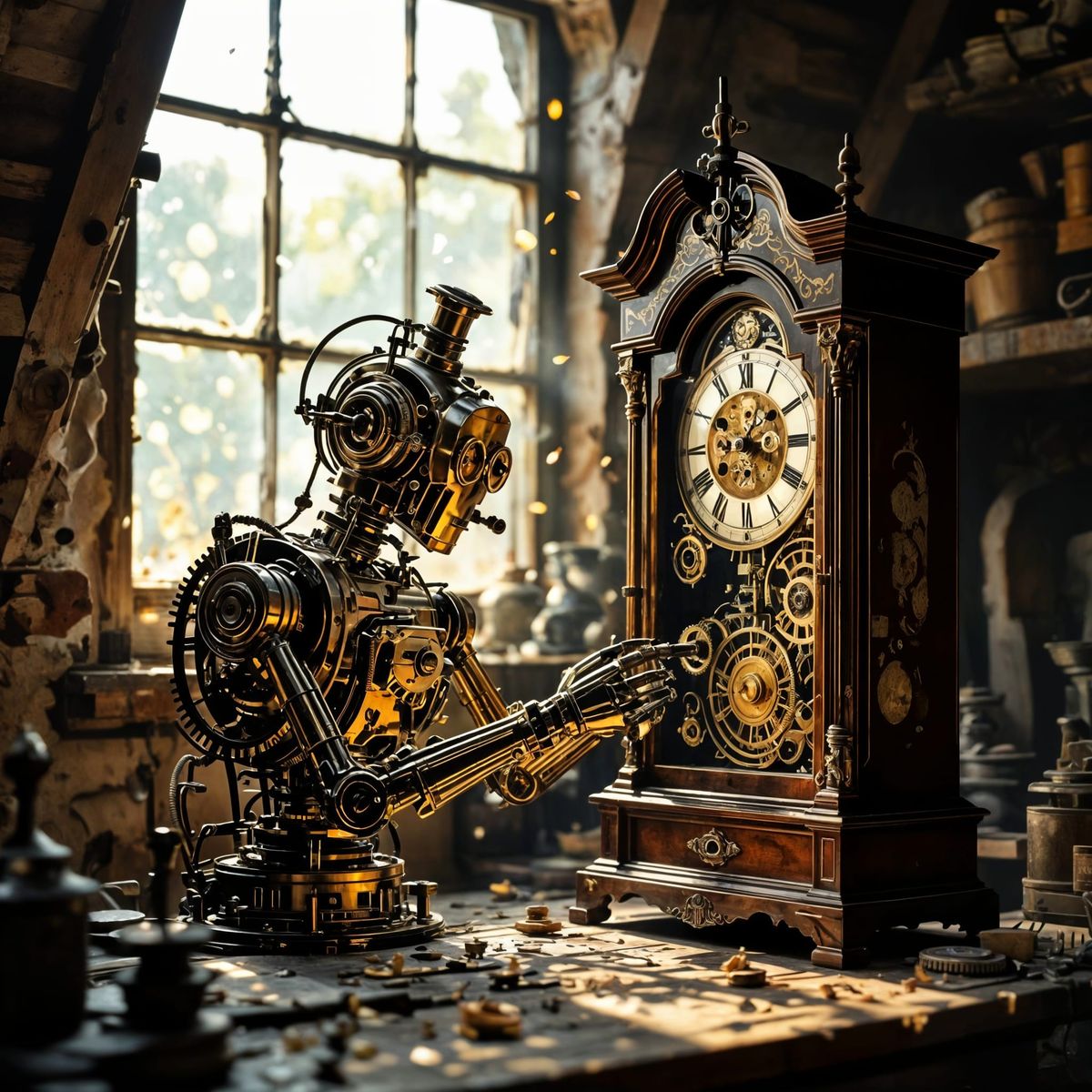 This image shows a vintage, steam-powered automaton fixing an antique grandfather clock. The scene, depicted in a detailed oil painting style, features warm colors and a nostalgic, dusty workshop atmosphere.