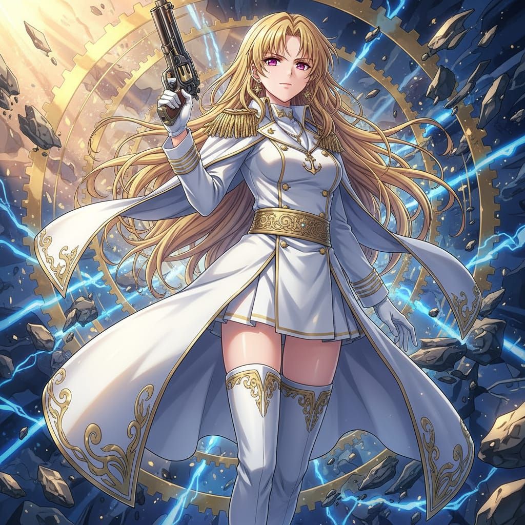 This image shows a determined young anime admiral in a white navy uniform with gold trim, pink eyes, and blonde hair. She holds a pistol, showcasing a commanding presence in a dynamic art style.