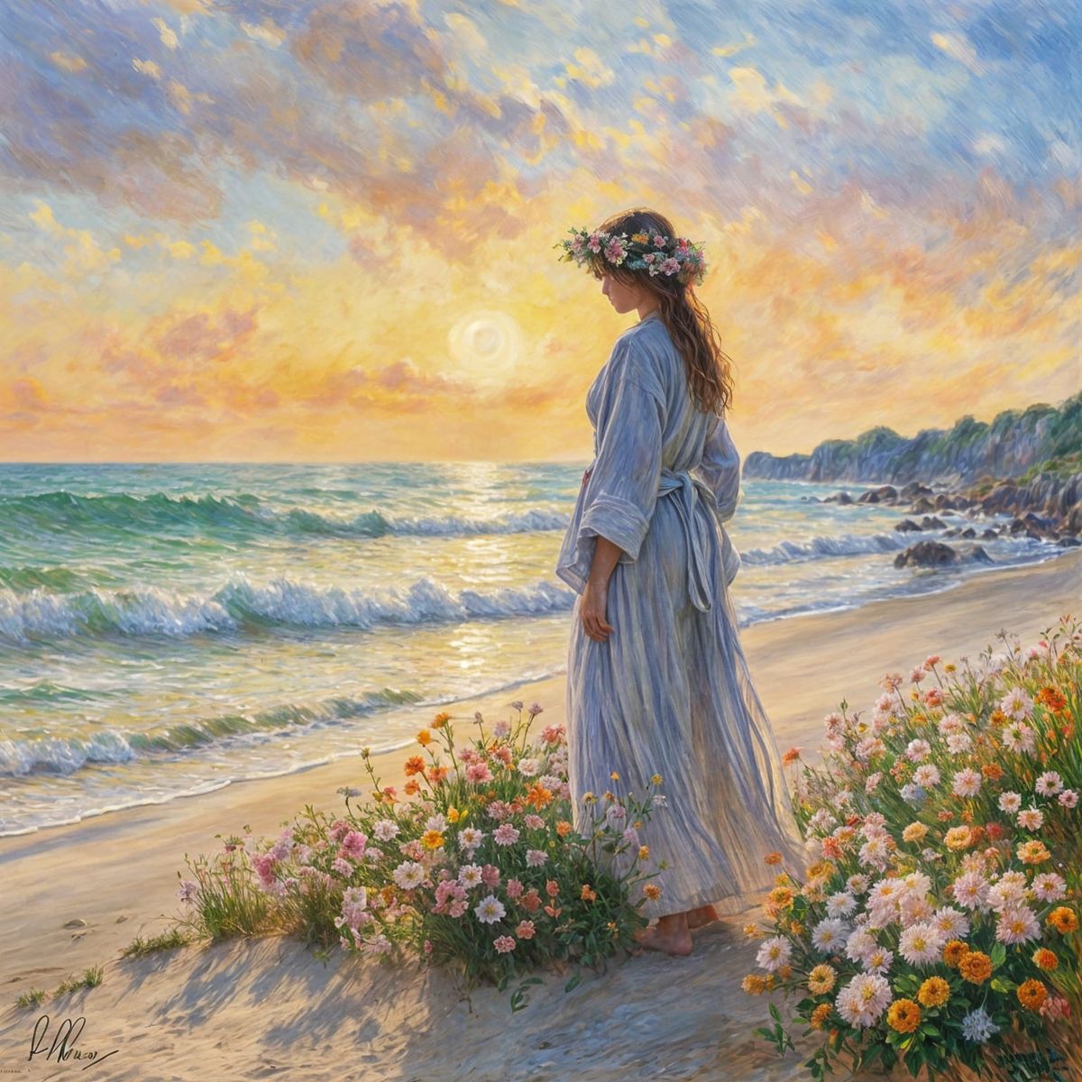 This image shows a serene and beautiful woman standing at the beach, surrounded by the warmth of a rising sun, her long hair adorned with flowers and her flowing robe catching the gentle breeze.