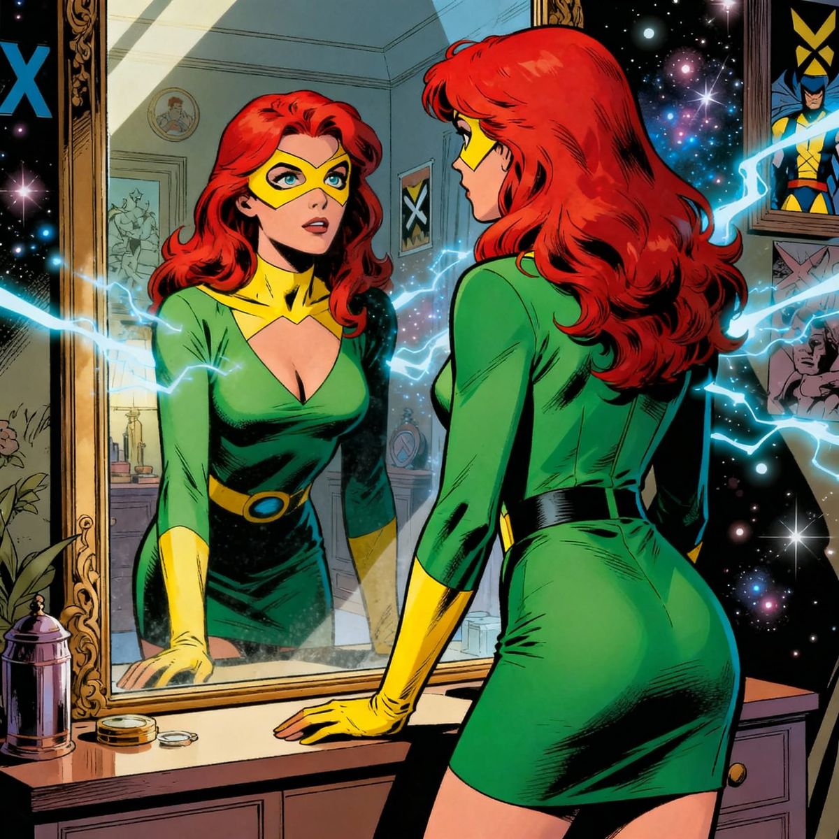 This image features Marvel Girl in her iconic green mini dress, looking at her reflection. The artwork captures the vibrant 1970s Marvel comics style with dynamic lighting and detailed lore.