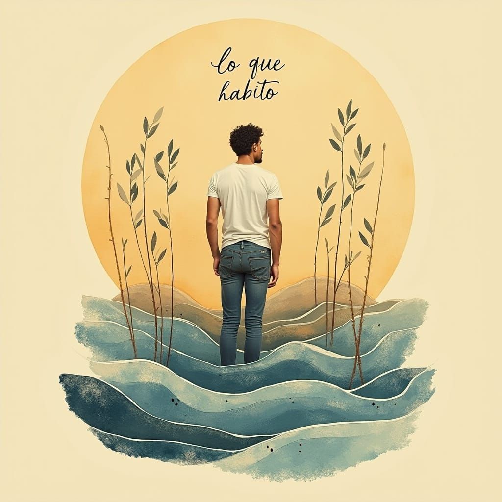 A serene image of a man's silhouette blending seamlessly with ocean waves and subtle leaves. The artwork features a warm ochre and beige background, astral and cosmic style, and ethereal textures.