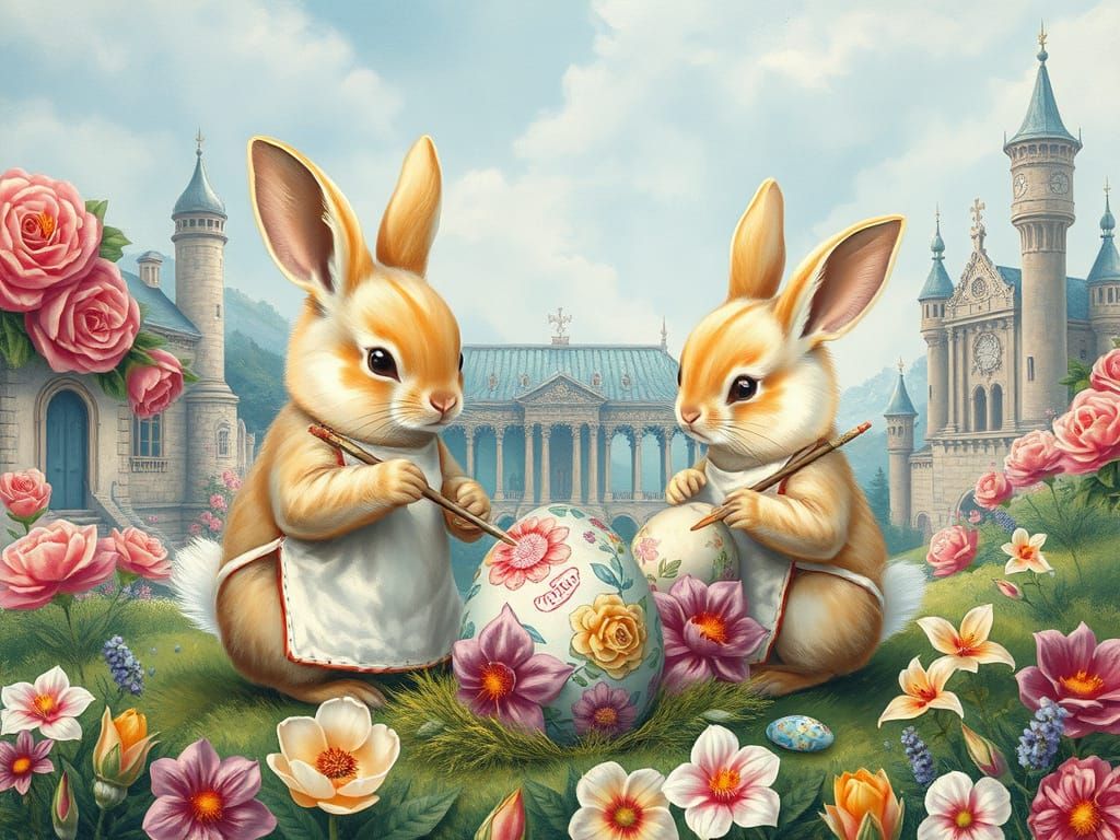 A vibrant image of bunnies and chicks painting Easter eggs in a fairy tale landscape. This gouache-style artwork, reminiscent of impressionist masterpieces, features floral motifs and thick, textured brushstrokes.