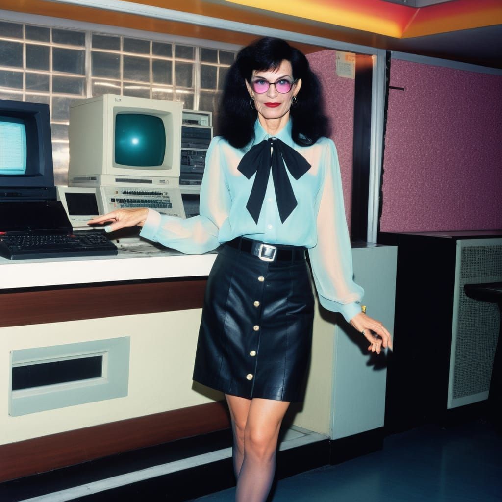 This image shows a stylish cross dresser in a cyberpunk night club setting, wearing a colorful blouse and knee high skirt, with a nod to 80s fashion and a touch of nerdiness.