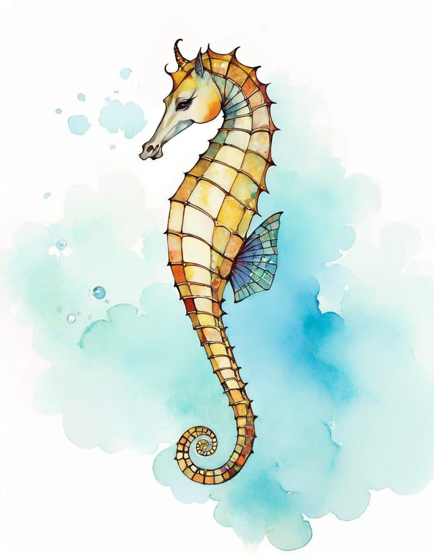 A vibrant image of a seahorse created using a triadic color scheme. The artwork exhibits a blend of illustrative and decorative styles reminiscent of golden age illustration.