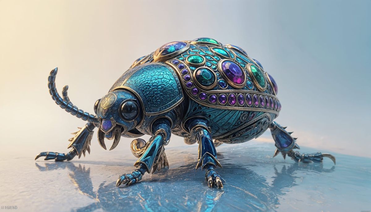 This image shows a vibrant, highly detailed scarab beetle adorned with jewels. The rendering is hyperrealistic, with a colorful background and dramatic lighting to enhance the intricate details.