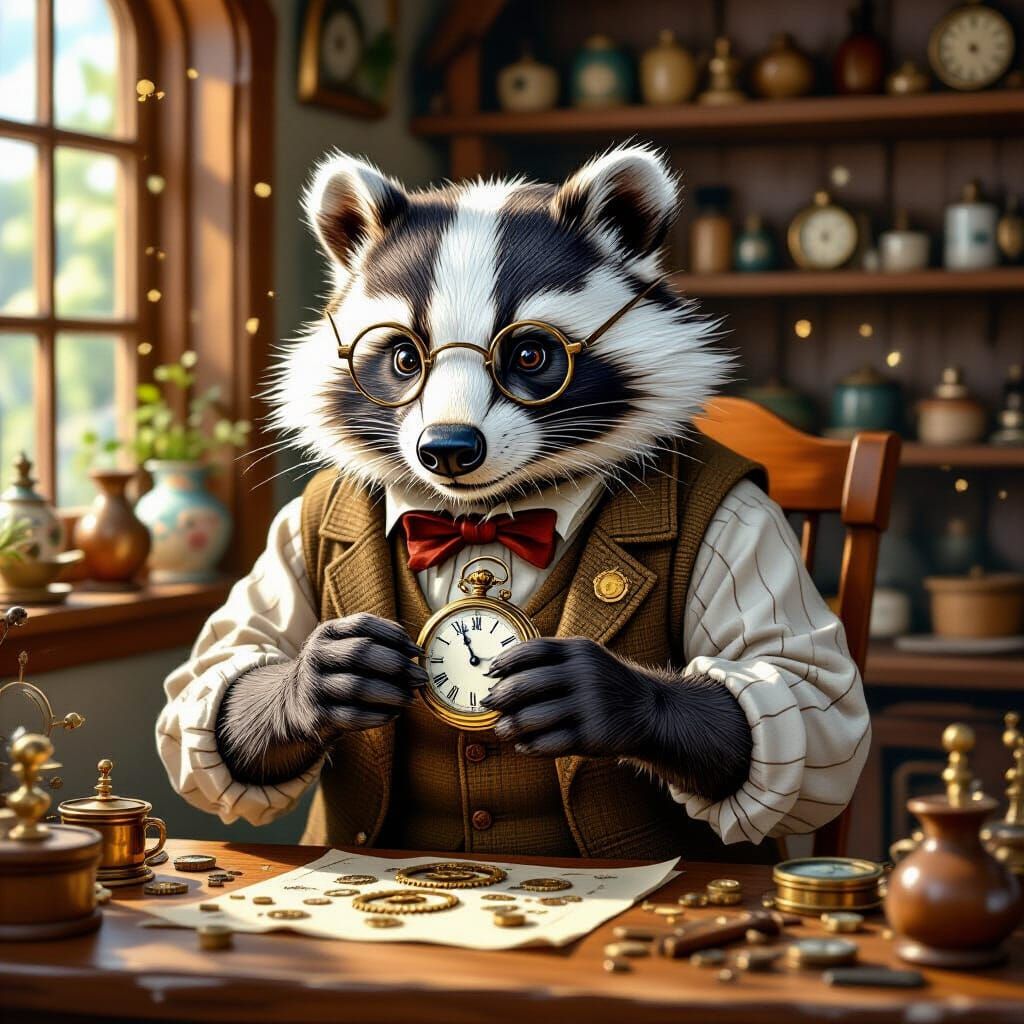 This image shows an anthropomorphic badger meticulously repairing a pocket watch in a sunlit workshop. The illustration is reminiscent of classic fairy-tale art with art nouveau flourishes.