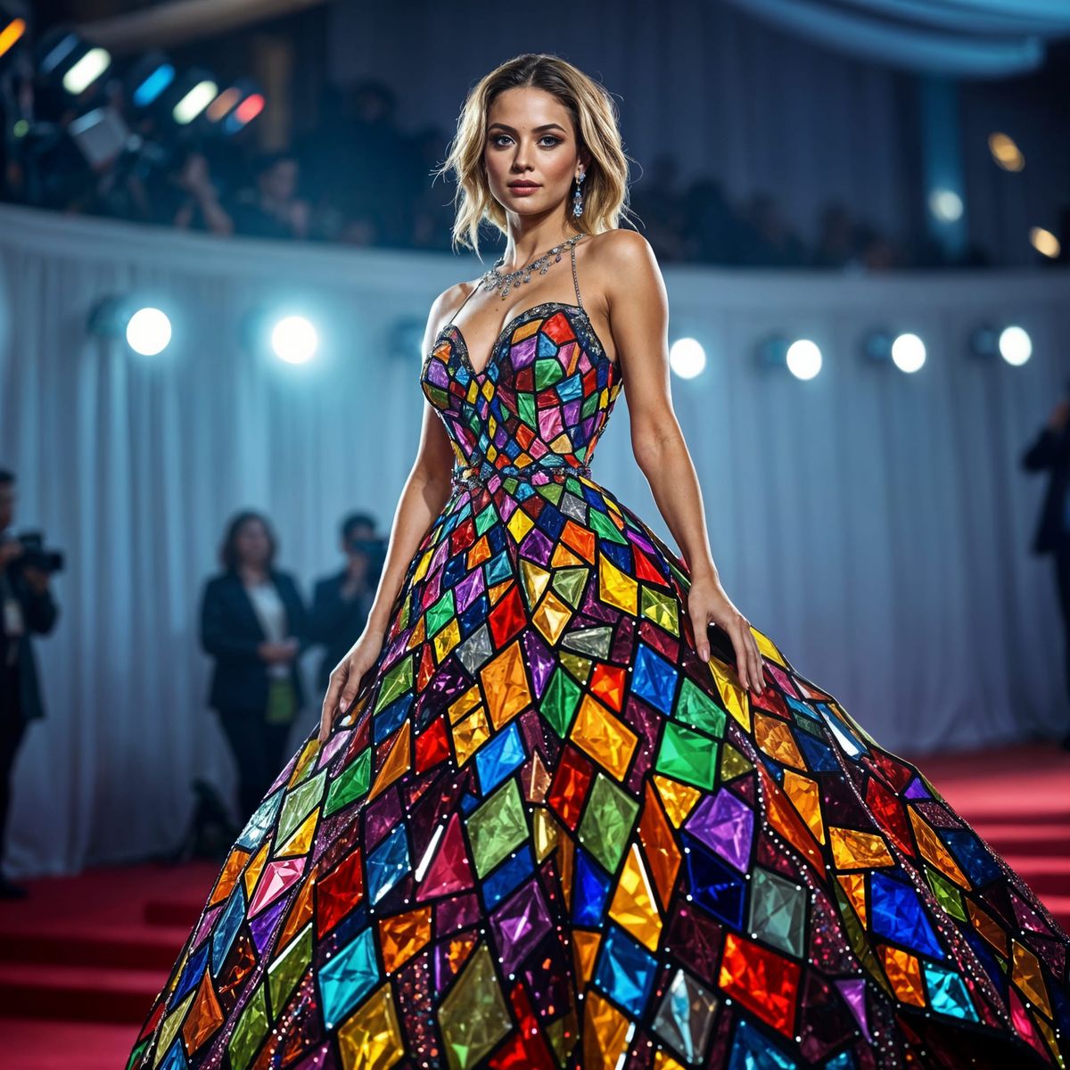 This image shows a starlet on the Met Gala red carpet in a fantastical ball gown constructed from dazzling, multi-colored stained glass.