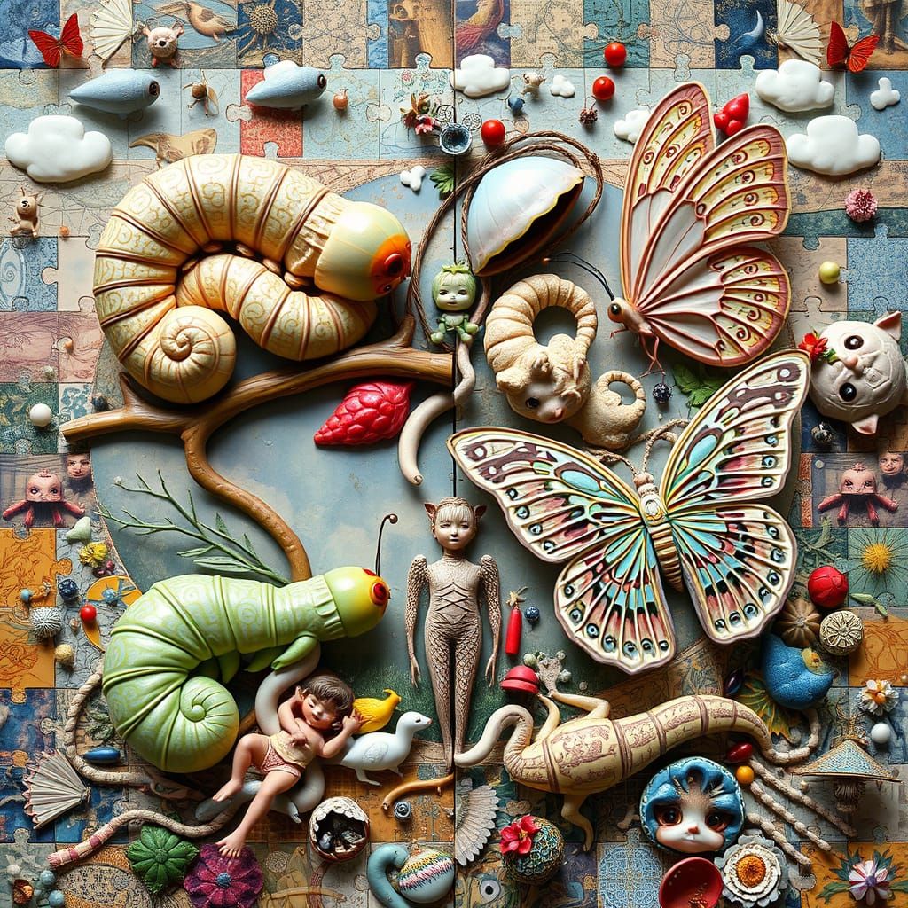 This enchanting, dreamlike art piece depicts a four-stage life cycle, from caterpillar to butterfly, in a mesmerizing, symbolic representation of transformation and self-discovery. Whimsical, handmade figurines blend fantasy and reality, set against a vibrant, puzzle-like tapestry of diverse elements and...