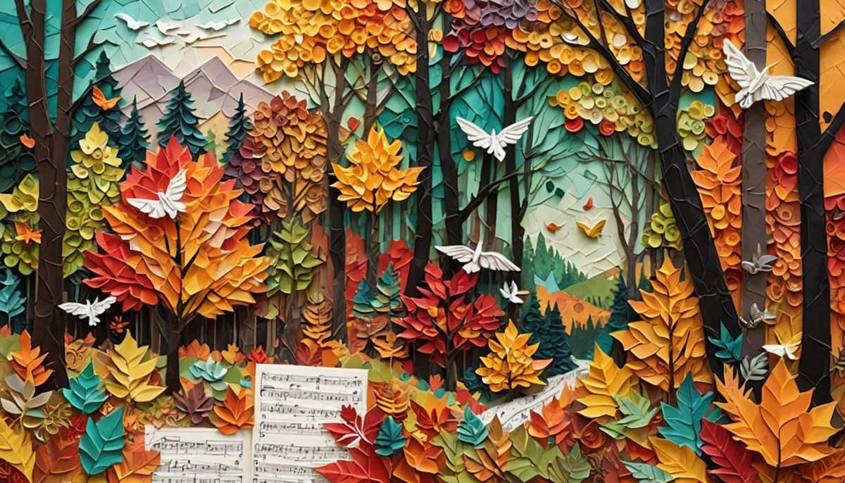 A striking picture of a vibrant autumn forest created with mixed media techniques. The image features layered textures, delicate papercraft details, and warm golden lighting, resulting in a whimsical and emotive scene.
