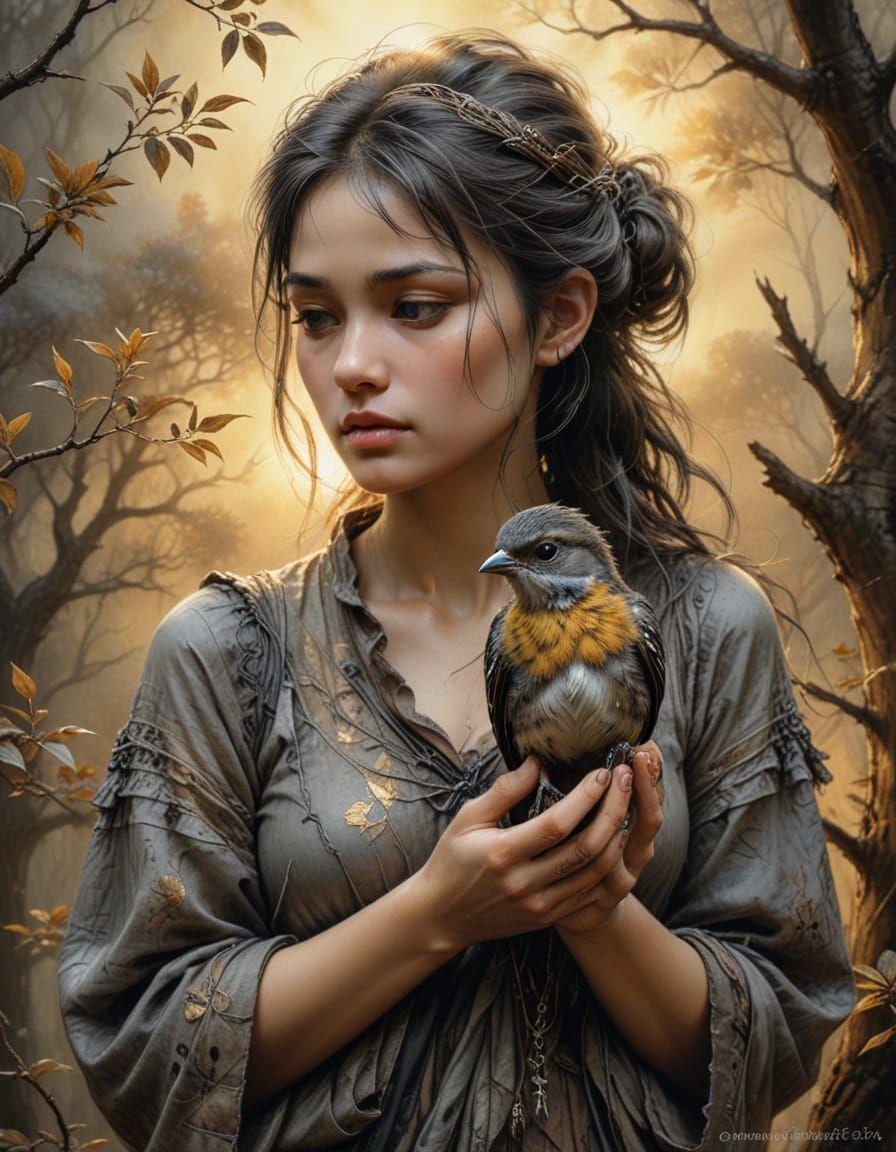 This image shows a motherly woman cradling a delicate bird. The drawing features expressive shading and soft textures in muted earth tones, reminiscent of golden hour lighting. The artwork evokes a mystical atmosphere.