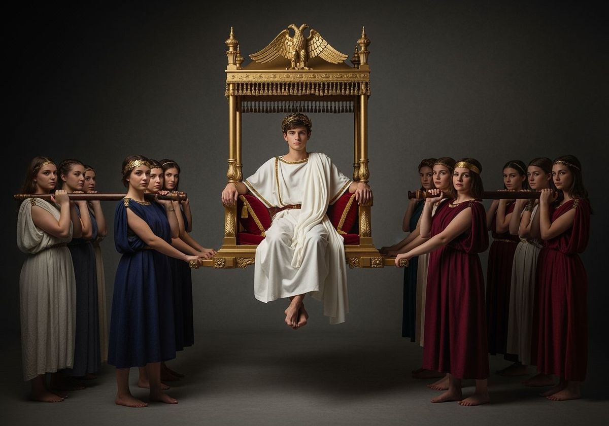 This image shows a young Roman emperor seated on a golden throne carried by servants. Shot in a professional studio, the scene features natural lighting, a bokeh effect, and sharp focus, reminiscent of high-quality DSLR photography.