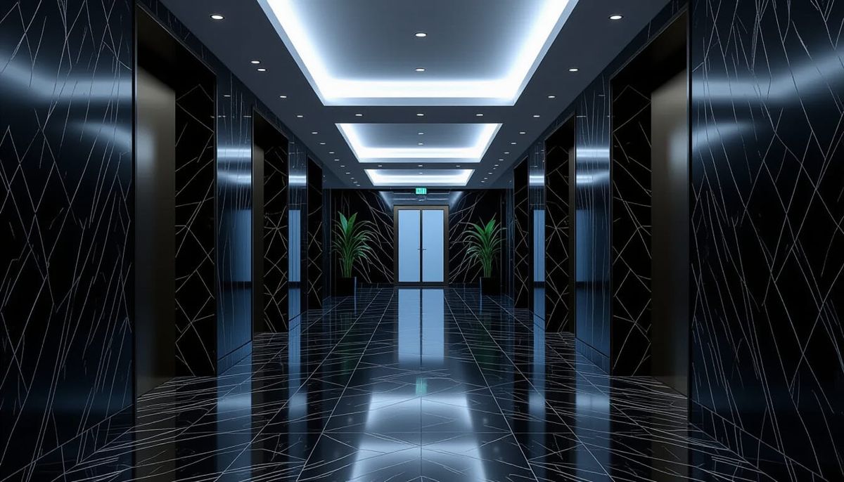 A striking picture of a desolate, dark hallway in an office. The shiny onyx tiles reflect cold, sterile lighting, creating a sense of unease. As a 4K resolution cinematic shot.