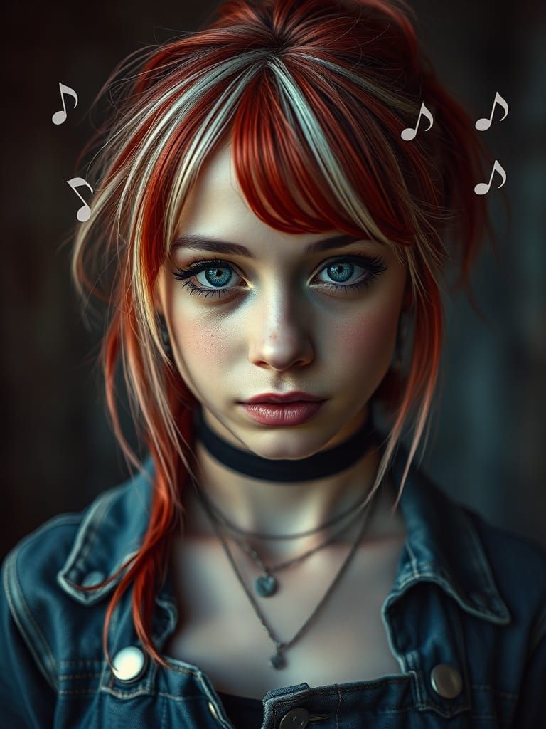 A high-quality, cinematic film still capturing a young woman with striking red hair, freckles, and unique androgynous fashion. Features a vintage film grain overlay and dramatic lighting.