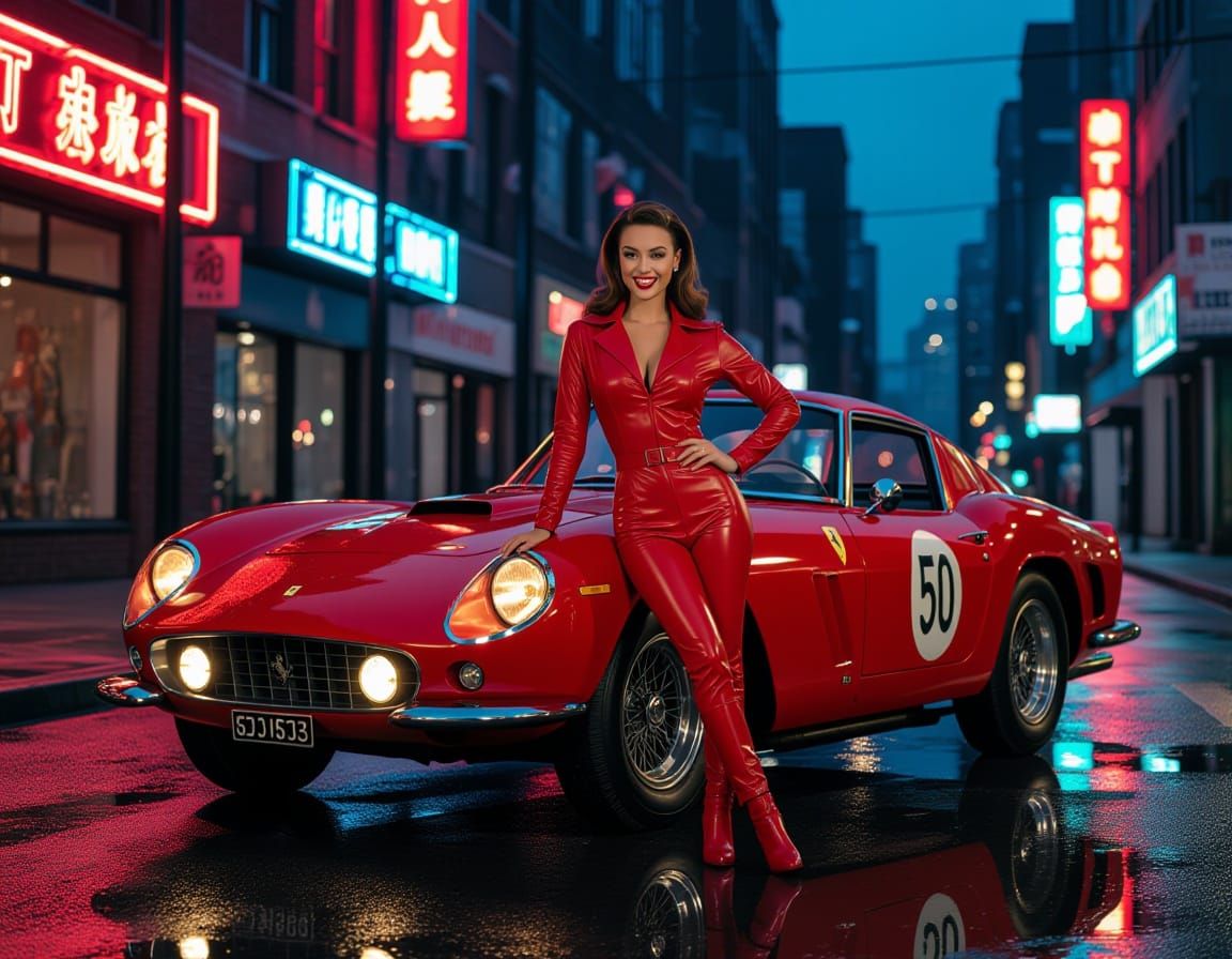 This image shows a confident pin-up model in a red racing suit leaning against a classic red Ferrari 250 GTO on a wet city street at dusk. Neon lights reflect vibrantly.
