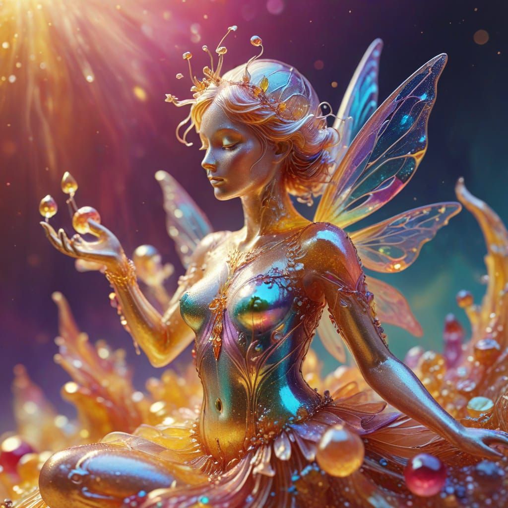 This image showcases a mesmerizing, dreamlike sculpture of a fairy made from wobbly gelatin, set against a soft pastel background with warm golden lighting and glowing iridescent colors.