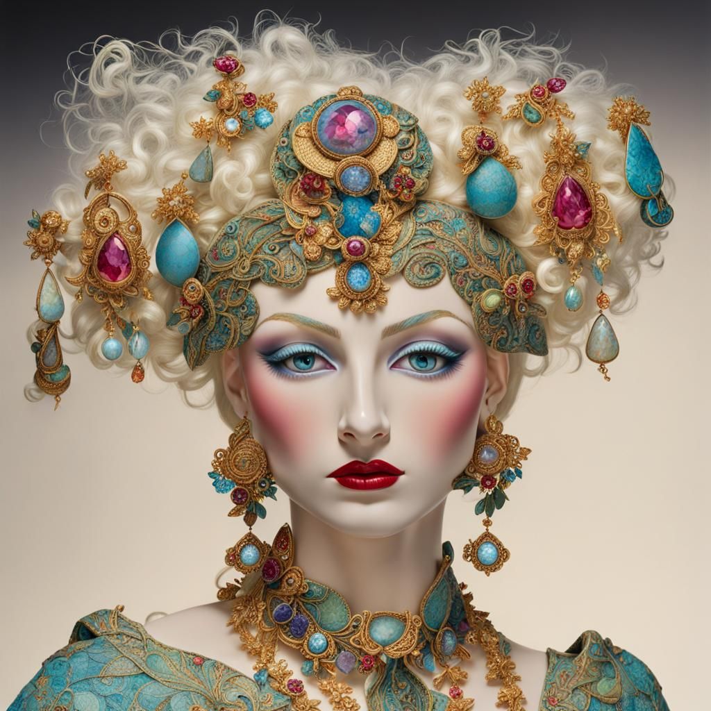A vibrant image of Muppet-like creatures in a tessellated cloisonné style. The artwork features intricate details with nacre beads and textile art elements, rendered with 3D shading.