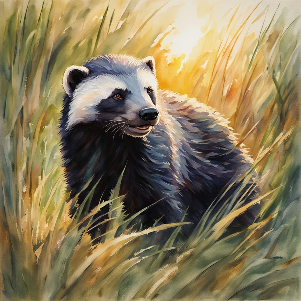 This watercolor painting captures a honey badger in medium shot, walking through impressionistic grasses at sunset. Experience a serene, masterpiece quality scene with vivid colors and warm golden hour light.