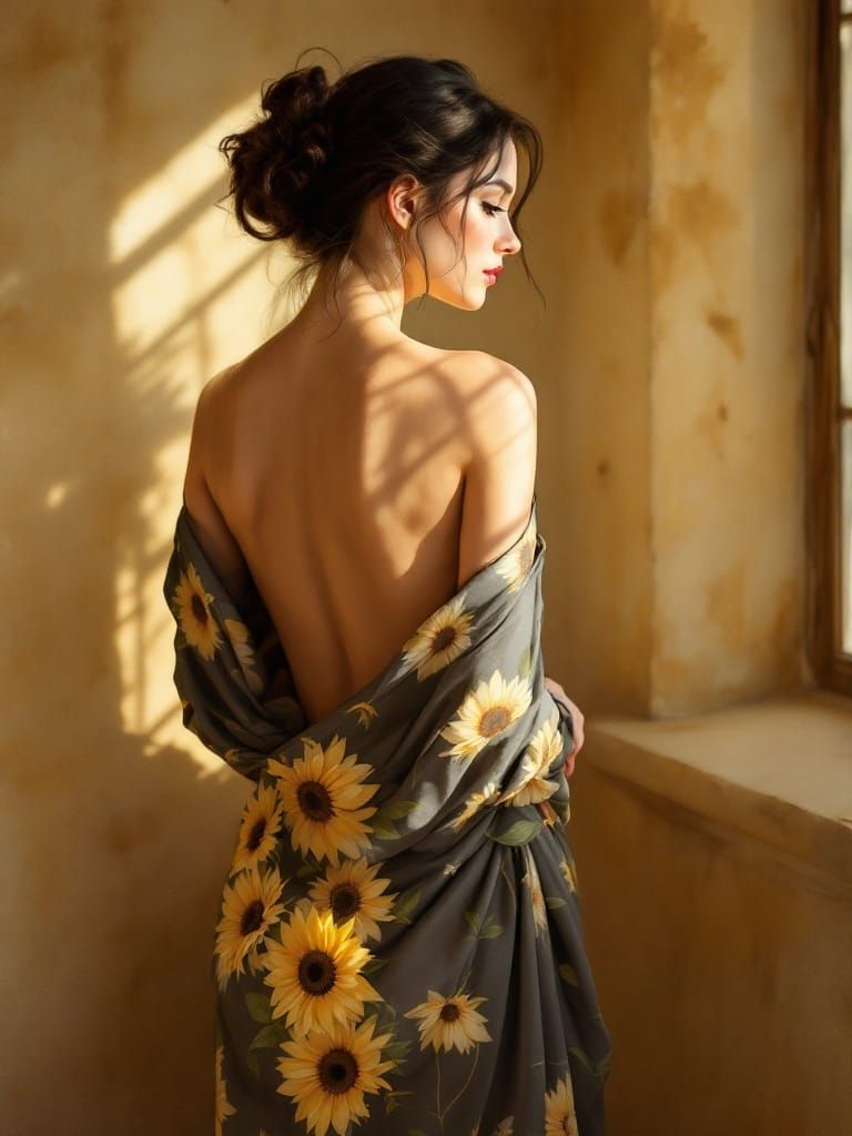 A captivating image of a woman with her back to the viewer, bathed in soft sunlight. The artwork evokes romantic naturalism with classical elegance, reminiscent of timeless watercolor realism.