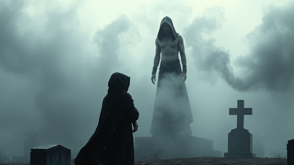 This image shows a gaunt figure emerging from smoke in a graveyard. He wears a black cloak with silver runes as a woman watches. The scene is lit with cold dawn light, creating a menacing mood.