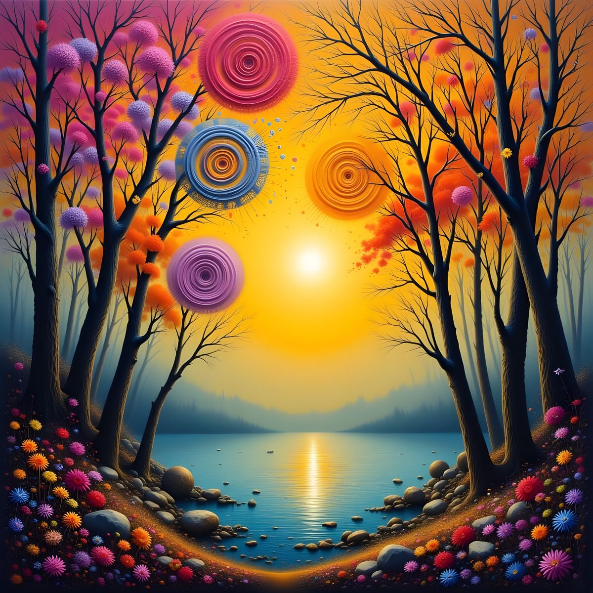This image shows dark trees with multicolored circular foliage swirling around a golden sunset sky. A tranquil lake and rocky shore with flowers complete the whimsical, dreamlike landscape.