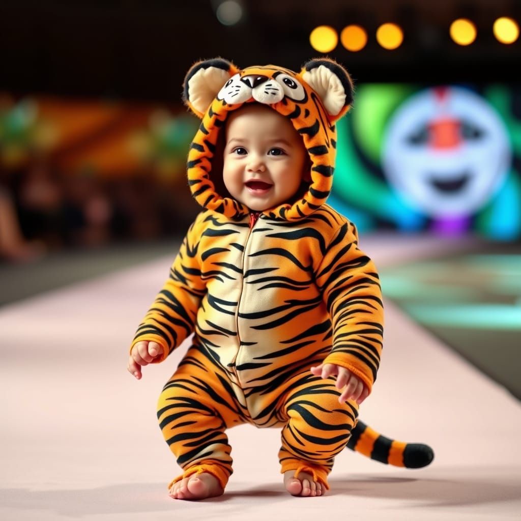 This image shows a joyful baby dressed in a tiger costume, walking confidently down a catwalk in a vibrant fashion setting.