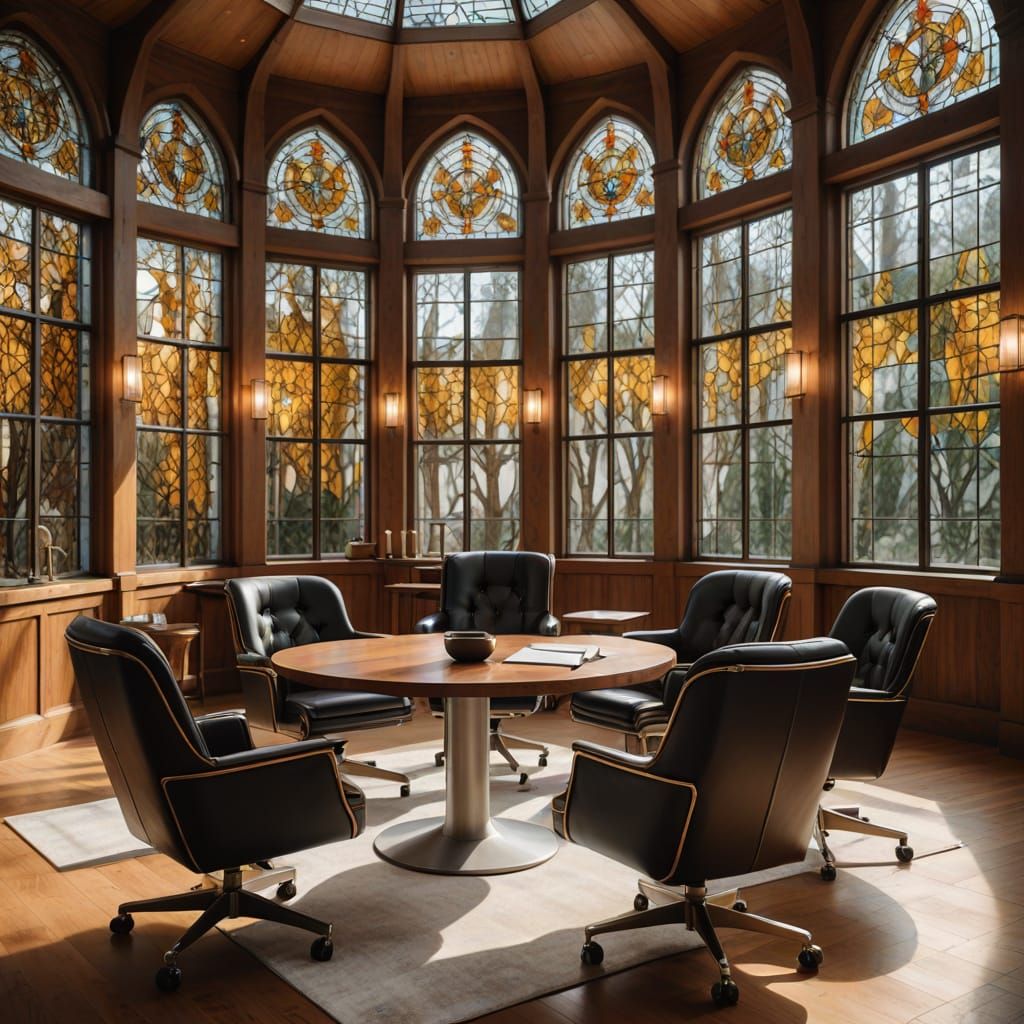 This image shows a modern law office interior featuring a solid wood table and leather armchairs. The room is filled with warm, natural light and elegant silver accents as a professional photograph.