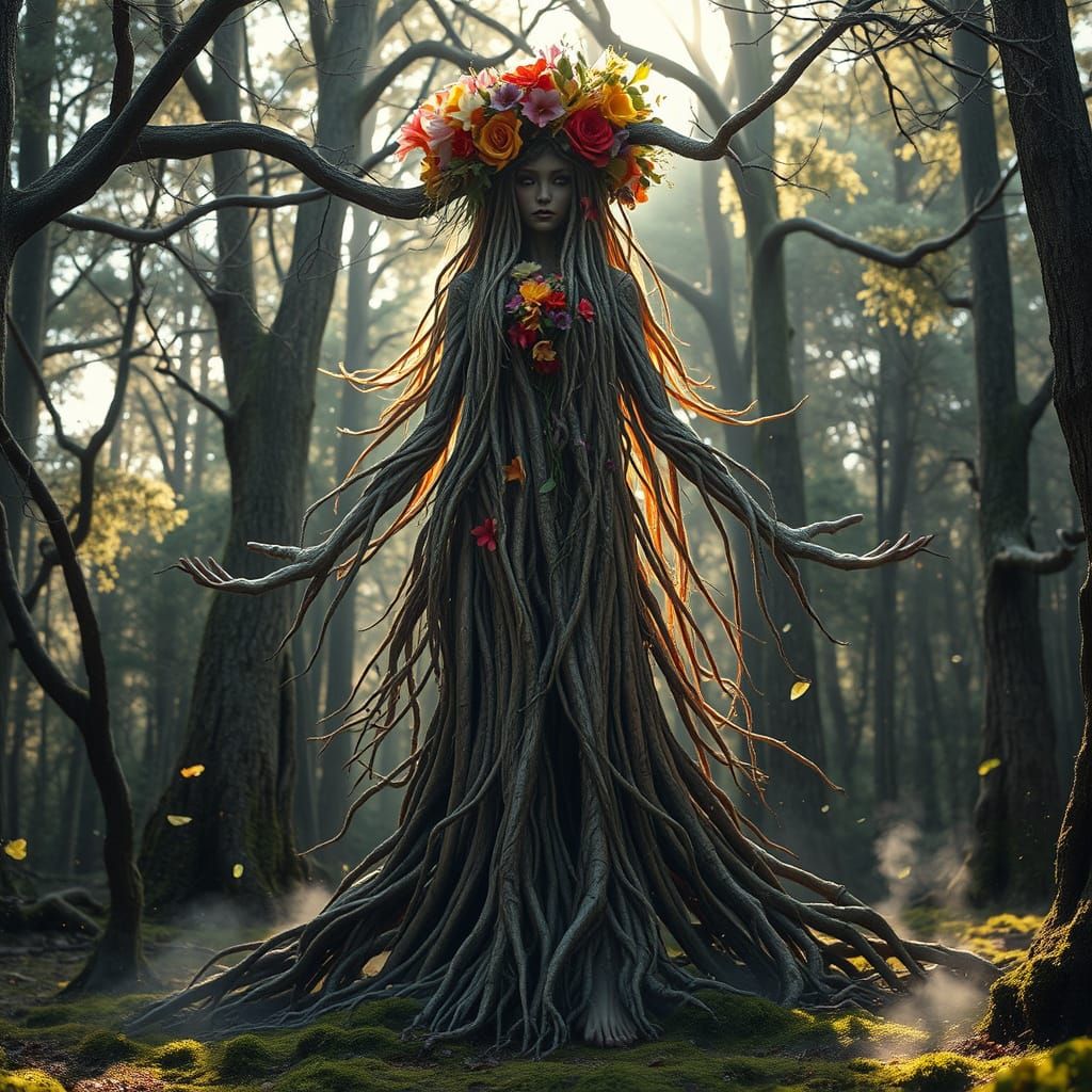 This image shows a towering figure of Gaia rising from the forest floor, formed from branches and wood. Flowers bloom along her shoulders, and willow strands form her hair in a dreamlike, Burton-esque style.