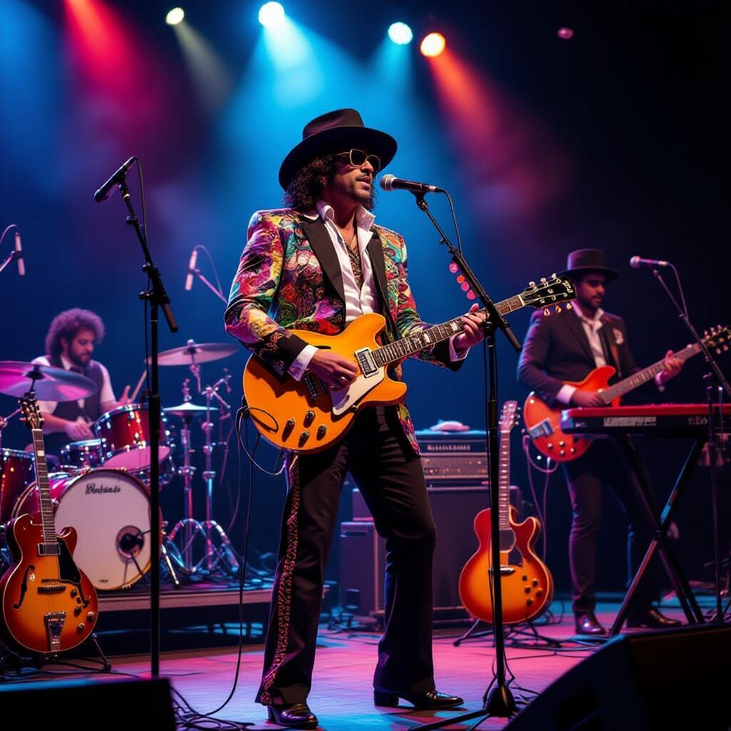 This image shows Chris Hilton performing on stage with his band, The Spacetracks. The vibrant and eclectic performance blends elements reminiscent of Prince, Bruno Mars, and D'Angelo.