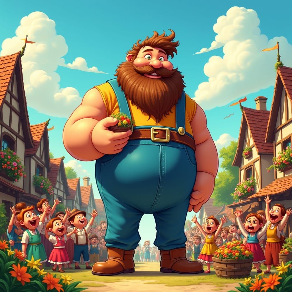A charming 2D animated illustration of a joyful village scene, featuring a kind giant surrounded by delighted villagers in traditional attire, amidst a sun-drenched background with quaint cottages and lush gardens, all bathed in a warm, golden light